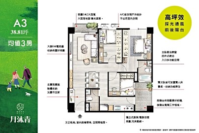 「月沐青」1279坪大基地,處處享大面積綠意,規劃10項全齡化豐富公設,由合遠建設攜手建築大師聶玉璞聯手擘劃,合遠建設深耕大桃園地區多年,成就超過3400戶美滿家園,追求品質、精益求精是合遠建設堅持的建築理念,隨著建築工法日新月異,「月沐青」1樓特別採用Alfa Safe耐震系統工法,頂樓採用拜鐵膜防水工法,由下至上全面精雕建築品質,讓住戶能夠住得安全放心。其中最受青睞的38坪3房,戶戶邊間、雙面採光,配置前後雙陽台,主浴開窗、無暗廳暗房,格局方正、公私領域分明,並規劃玄關落塵區,超大面寬8米電視牆、3米2深度,尺度寬敞舒適,廚房獨立區域,規劃精品設備及建材,全方位提升整體居住質感。