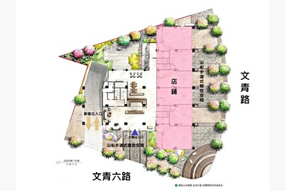 以一樓全區平面圖來看,粉紅色色塊的部分為店面戶,皆面向主幹道文青路,大樓出入口與車道則是由文青六路進出。