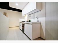 廚房空間採一字型的規劃,連接工作陽台,工作陽台也是長型的規劃,這樣的優點採光面積較多,衣服比較容易曬得乾,泥摳小姐又有地方媽媽思維了。