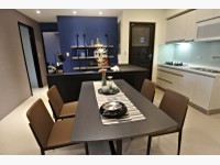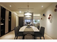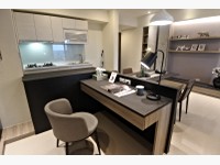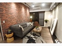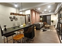 再來看到阿宅個人最愛的B1風格,這間實品屋3房2廳2衛2陽台,雙採光。B1是美式工業風,裸露的水管灰牆搭配深色調的裝潢,尤其客廳的那面紅磚牆畫龍點睛,直接吸引目光,營造美式TALK SHOW的棚內現場;客餐廳聯通,餐廳採類似酒吧的吧檯桌和高腳椅,讓人很想在這裡喝酒阿XD