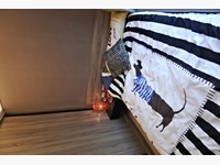 次臥採光明亮,空間剛剛好,放下加大單人床、床頭桌、衣櫃後就差不多了。共衛浴有開窗採3件式,沒乾濕分離、沒浴缸,建商為了避掉開門見灶的風水問題,還特別做了小玄關的設計。