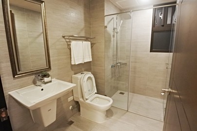 主臥空間充足採光明亮,放下雙人床衣櫃和床檯桌後,還不會感到壅擠,主衛浴有開窗,採3件式乾濕分離沒有浴缸。