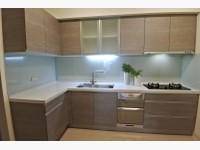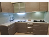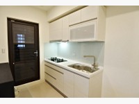 廚房有獨立空間和拉門隔離,讓油煙不會亂竄,L型廚房配有林內雙機,和喜特麗烘碗機,可以直接到工作陽台動線流暢。