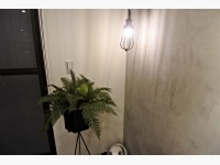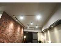 這間有不少個性擺飾,和系統收納,像是符合工業風的水管燈、營造得像棚內的各種燈光,鑲在牆上的收納櫃等