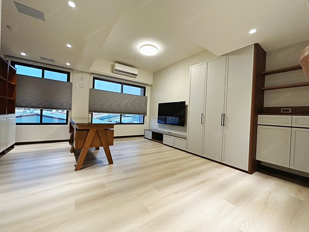 3.客廳附贈柚木書櫃及書桌.窗戶均有貼鏡像隔熱貼.日立冷氣兩台.Sony65吋電視.三面冷蜂巢窗簾.天花板日本淺野