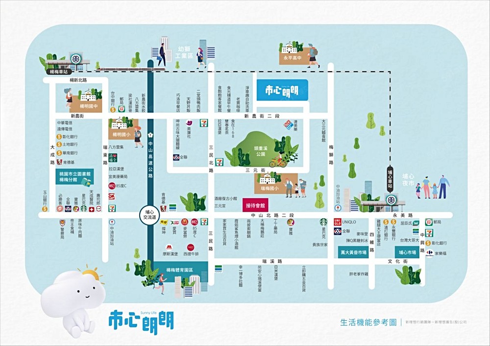 另一方面,受惠於新農街的適中區位,銜接楊梅交流道僅需約3分鐘車程,往返縱貫路、埔心、大成路等既有商圈動線直觀,均落於約10分鐘車程範圍內。