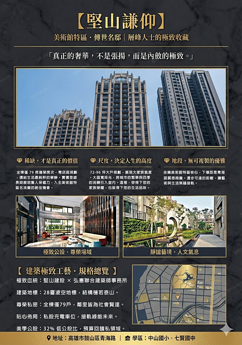 在這座城市最令人嚮往的青海路藝術軸線上,【堅山謙仰】宛如一座靜謐的城堡,傲然聳立。這不只是一處居所,更是堅山建設獻給高雄層峰領袖的傳世藝術品。