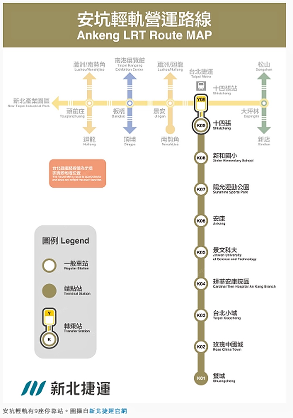 (K01)雙城站(K02)玫瑰中國城站(K03)台北小城站(K04)耕莘安康院區站(K05)景文科大站(K06)安康站(高架)(K07)陽光運動公園站(高架) (K08)新和國小站(高架) (K09)十四張站(高架)